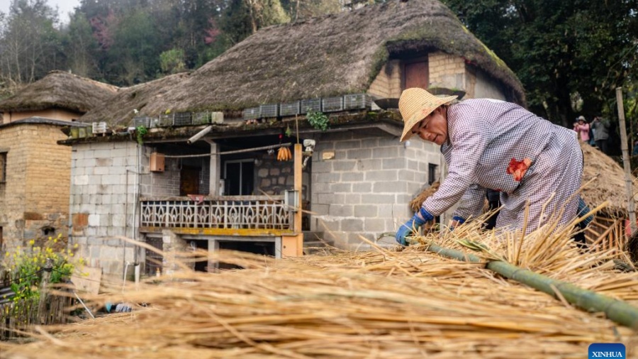 Imagen del 26 de febrero de 2025 de un aldeano manteniendo el tejado de paja de las casas tradicionales Hani, conocidas localmente como "casas hongo", en la aldea de Azheke del distrito de Yuanyang de la prefectura autónoma hani y yi de Honghe, en la provincia de Yunnan, en el suroeste de China.…