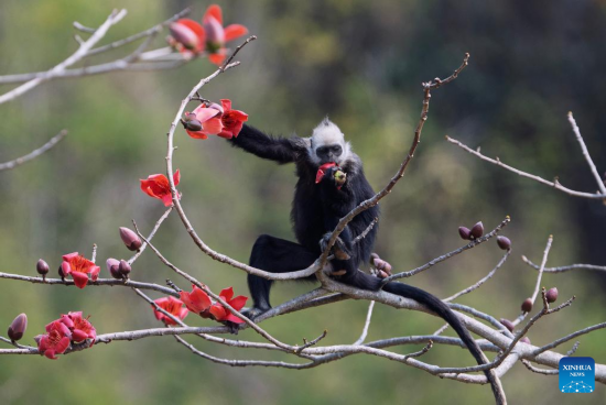CHONGZUO, 27 marzo, 2025 (Xinhua) -- Imagen del 26 de marzo de 2025 de un langur de cabeza blanca comiendo una flor de algodón de seda en una reserva natural nacional, en el distrito de Jiangzhou, en la ciudad de Chongzuo, en la región autónoma de la etnia zhuang de Guangxi, en el sur de China.…