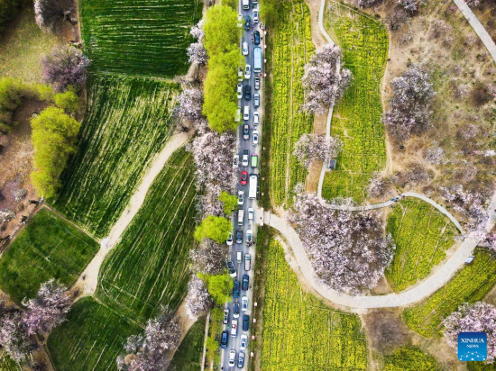GUIYANG, 26 marzo, 2025 (Xinhua) -- Vista aérea tomada con un dron el 25 de marzo de 2025 de turistas observando los cerezos en flor en un jardín de cerezos, en la Nueva Area de Gui'an, en la provincia de Guizhou, en el suroeste de China.…