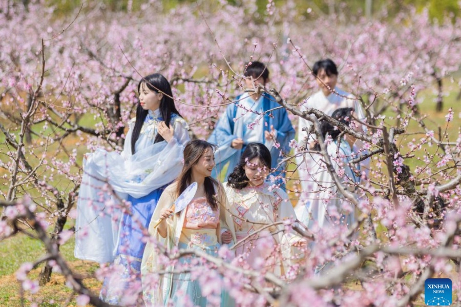 Turistas disfrutan del paisaje de flores en un parque, en la ciudad de Xiaogan, en la provincia de Hubei, en el centro de China, el 18 de marzo de 2025.…