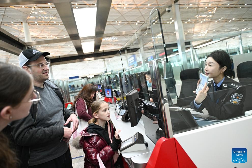 La oficial de inmigración, Chen Miao (d), maneja los procedimientos de exención de visa de tránsito para turistas de Estados Unidos en el área de inmigración del Aeropuerto Internacional Capital de Beijing, en Beijing, capital de China, el 28 de enero de 2025.…