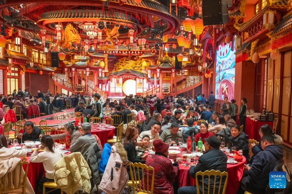 Personas participan en comidas de reunión en un restaurante, en la ciudad de Wuhu, en la provincia de Anhui, en el este de China, el 28 de enero de 2025. Cenar con los miembros de la familia en una comida de reunión ha sido una tradición apreciada para los chinos la víspera de la Fiesta de la Primavera, que cae el 29 de enero este a?o. (Xinhua/Xiao Benxiang)…