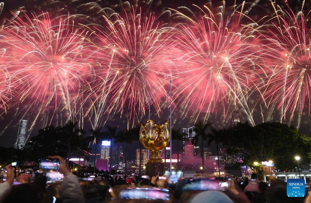 Fuegos artificiales iluminan el cielo sobre el puerto Victoria en celebración de la Fiesta de la Primavera, en Hong Kong, en el sur de China, el 30 de enero de 2025.…