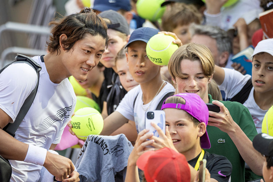 Zhang Zhizhen firma autógrafos y posa para fotografías con aficionados en Roland Garros el 27 de mayo de 2023 en París, Francia.…