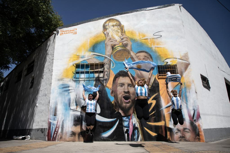 BUENOS AIRES, 30 diciembre 2022 (Xinhua) -- Florencia (i), Mónica (c) y Carolina (d), tres amigas de la localidad de Hurlingham, saltan frente a un mural de Lionel Messi levantando la Copa Mundial de la FIFA, realizado por el artista argentino Maximiliano Bagnasco, en el barrio de Palermo, en la ciudad de Buenos Aires, Argentina, el 30 de diciembre de 2022.…