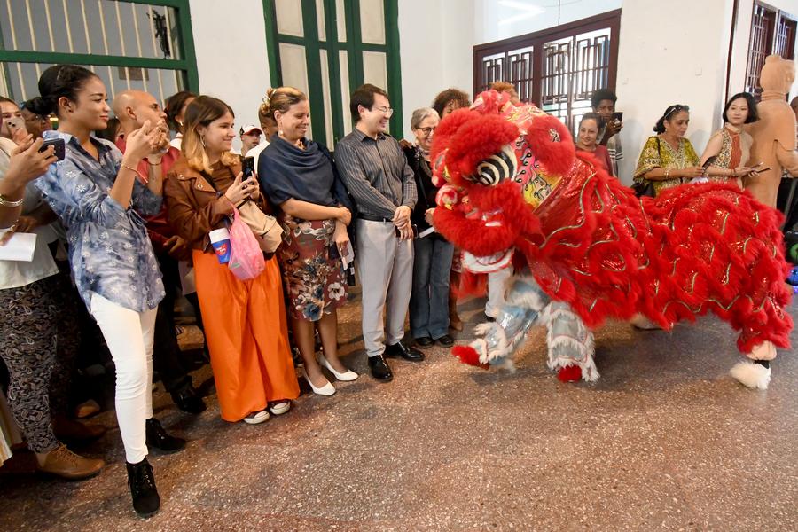 Imagen del 17 de enero de 2025 de personas observando una presentación de la danza del león previo a la inauguración de la exposición titulada "Ecos de la Opera Cantonesa" en la Casa de Artes y Tradiciones Chinas, en el Barrio Chino de la Habana, capital de Cuba.…