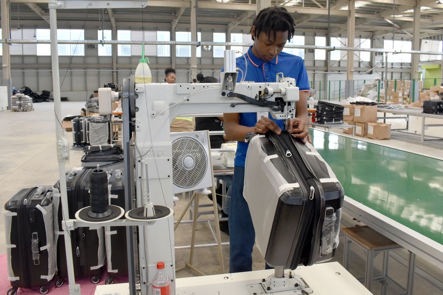Imagen del 5 de septiembre de 2023 de un empleado trabajando en la fabricación de maletas en una instalación del moderno polígono industrial Phoenix Park, construido por la empresa china Beijing Construction Engineering Group (BCEG), en Puerto Espa?a, Trinidad y Tobago.…