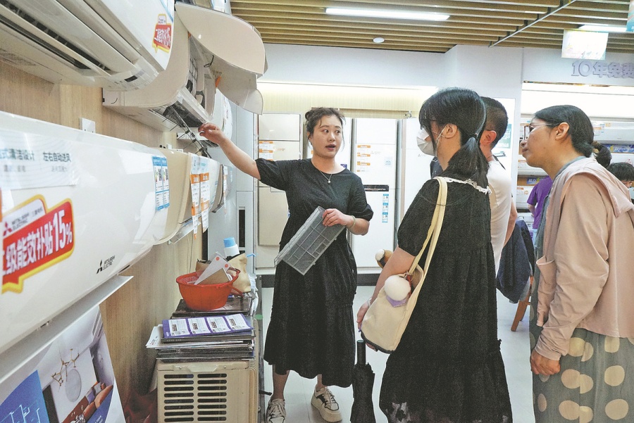 Compradores observan máquinas de aire acondicionado que ofrecen subsidios en el comercio de intercambio en una tienda de Jiaxing, provincia de Zhejiang.…