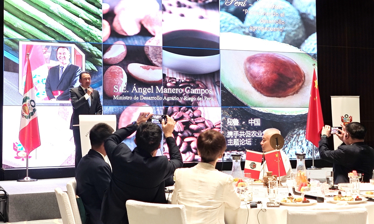 ángel Manero Campos, ministro de Desarrollo Agrario y Riego de Perú pronuncia un discurso en Beijing, 3 de julio del 2025.…