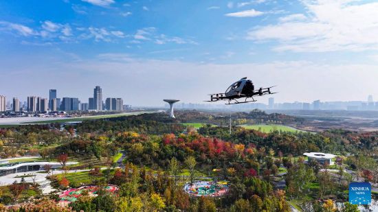 HEFEI, 26 junio, 2025 (Xinhua) -- Vista aérea sin fechar tomada con un dron de un vehículo eléctrico de despegue y aterrizaje vertical realizando una demostración de vuelo en el parque Luogang, en Hefei, en la provincia de Anhui, en el este de China.…