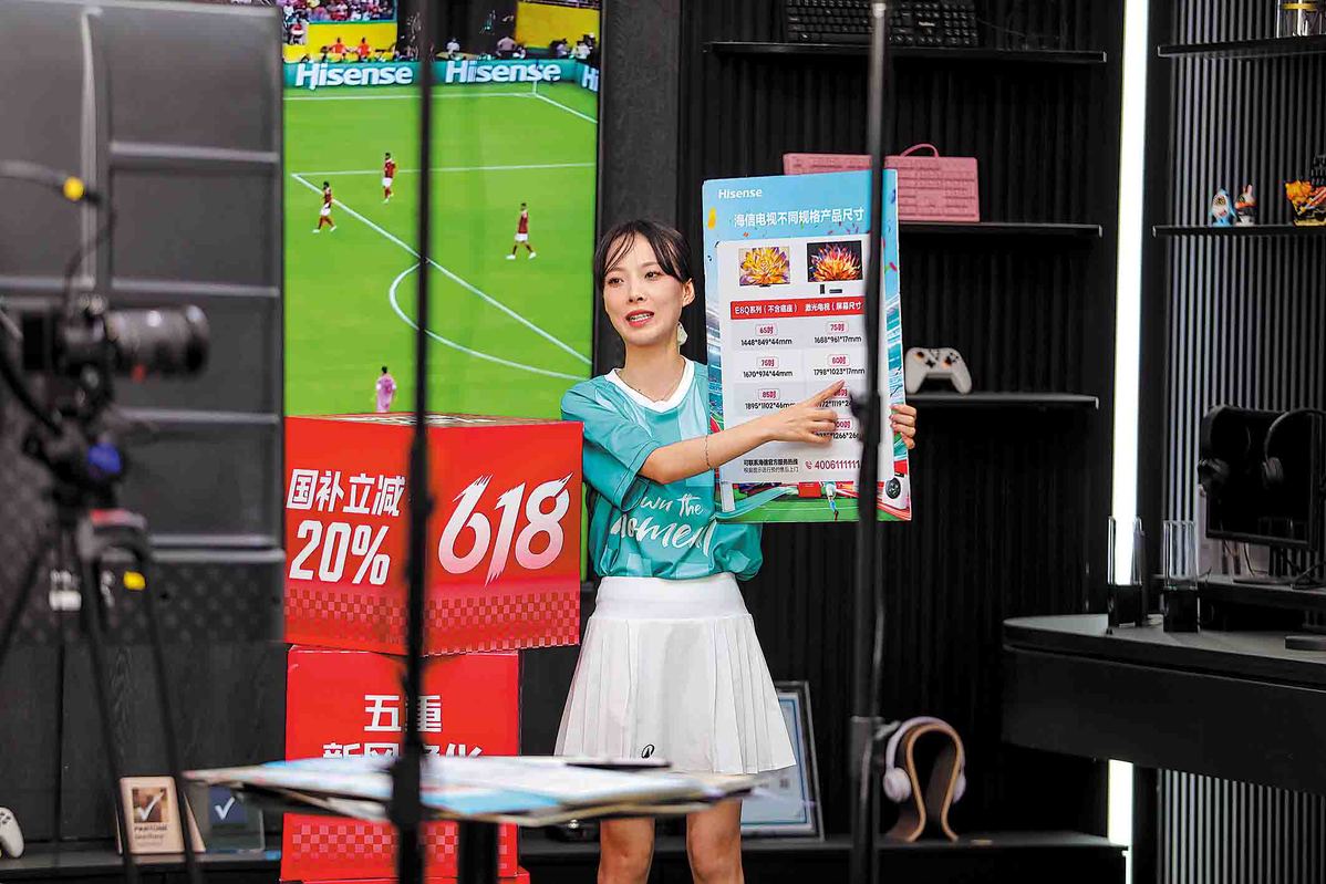 Una presentadora de transmisión en vivo promueve las ventas de electrodomésticos en Qingdao, provincia de Shandong.…