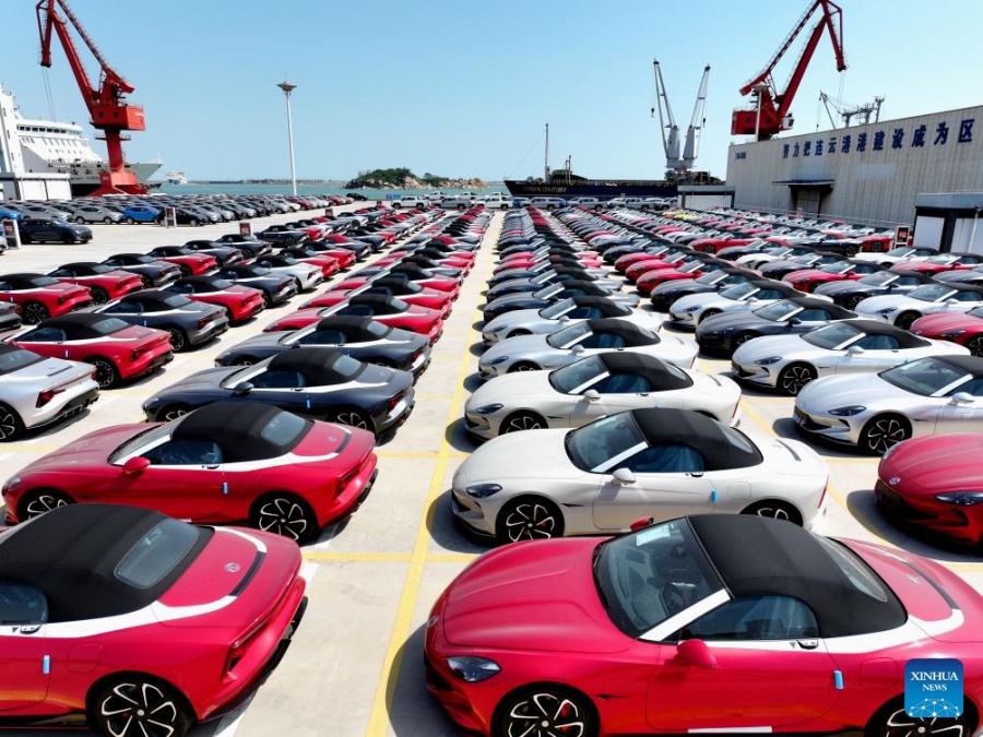 Imagen tomada con un dron el 16 de junio de 2025 de vehículos que serán transportados en el Puerto de Lianyungang, en la provincia de Jiangsu, en el este de China.…