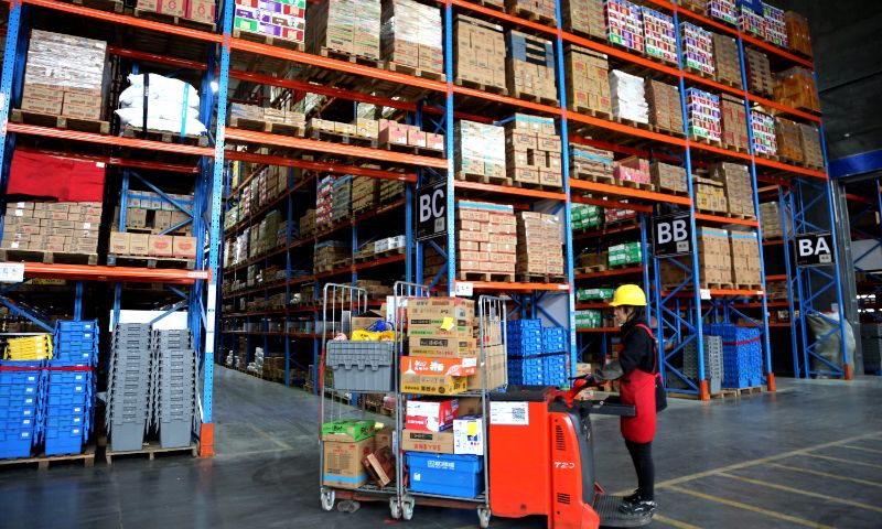 Un trabajador clasifica productos para su transbordo en un almacén logístico de comercio electrónico en Lianyungang, provincia de Jiangsu, este de China.…
