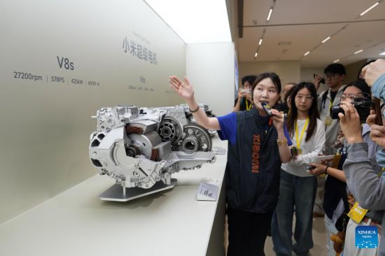 BEIJING, 16 junio, 2025 (Xinhua) -- Visitantes aprenden sobre el HyperEngine de Xiaomi, en la fábrica automotriz de Xiaomi, en Beijing, capital de China, el 16 de junio de 2025.…