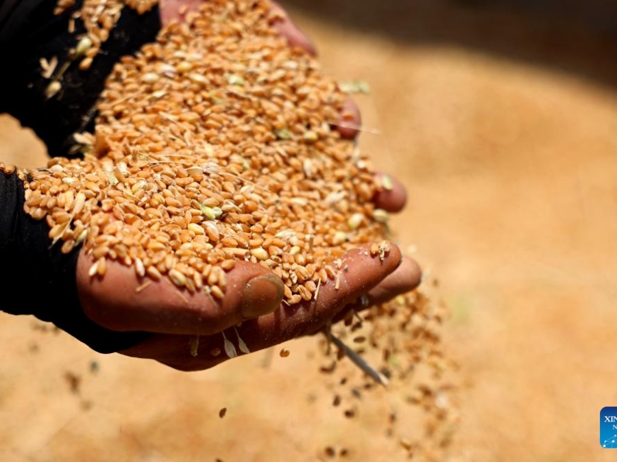 Un agricultor muestra trigo recién cosechado, en la aldea de Shagou de la ciudad de Zaozhuang, en la provincia de Shandong, en el este de China, el 25 de mayo de 2025.…