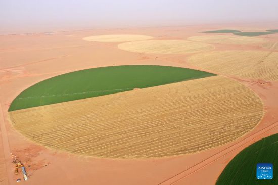 EL CAIRO, 6 mayo, 2025 (Xinhua) -- Vista aérea tomada con un dron el 3 de mayo de 2025 de las tierras de cultivo, en el desierto de la Gobernación de Nuevo Valle, Egipto.…