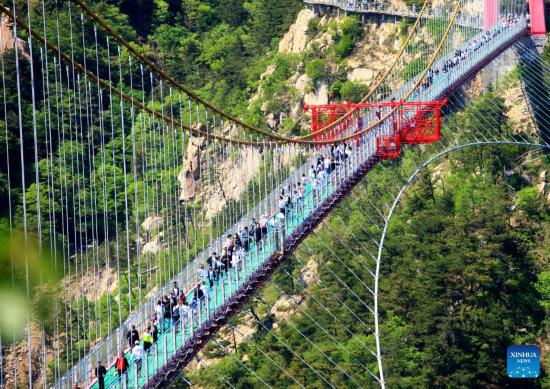 LINYI, 6 mayo, 2025 (Xinhua) -- Vista aérea tomada con un dron el 3 de mayo de 2025 de turistas caminando por un puente colgante peatonal construido en las monta?as Yimeng, en Linyi, en la provincia de Shandong, en el este de China.…