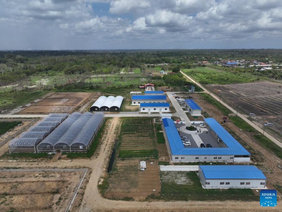 Vista aérea tomada con un dron el 3 de abril de 2024 del Centro de Cooperación Técnica Agrícola de Surinam, que recibe ayuda de China, en el distrito de Saramacca, Surinam.…