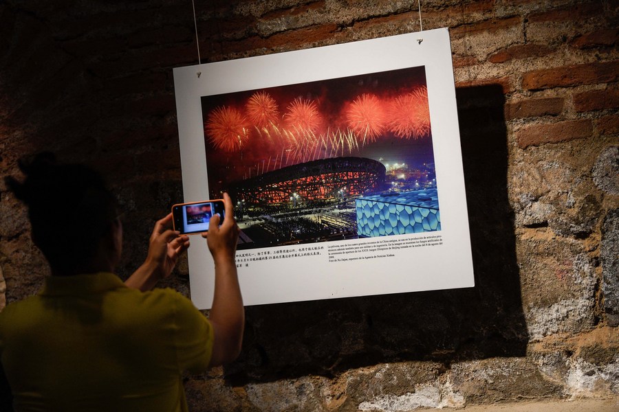 Imagen del 10 de enero de 2023 de una persona tomando una fotografía con su teléfono móvil durante la inauguración de la exposición fotográfica "China: avances en el siglo XXI" en la Casa de la Cultura de San Miguel, en la comuna de San Miguel, en Santiago, capital de Chile.…