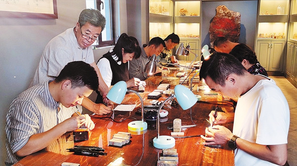 Qian Gaochao ense?a a los estudiantes las habilidades del tallado en piedra.…