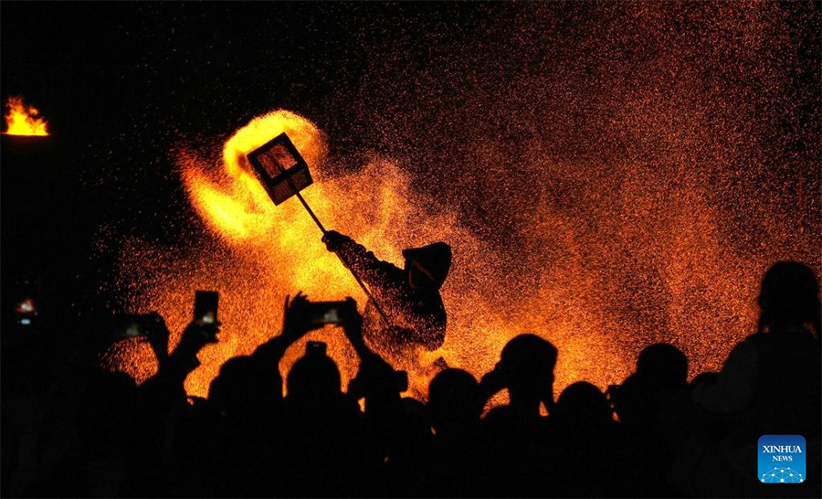 Artistas folclóricos lanzan hierro fundido para crear fuegos artificiales en Haiyang, Shandong