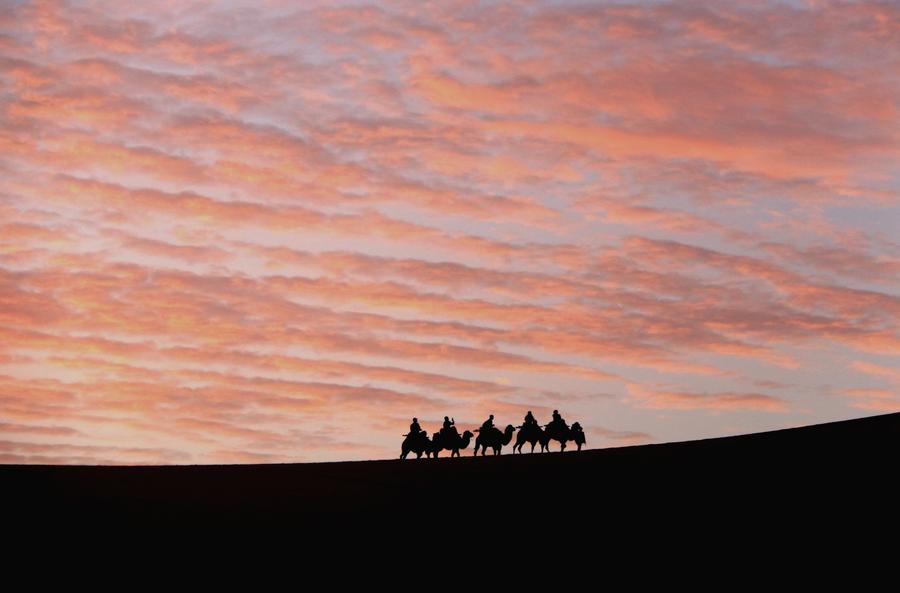 La imagen, tomada el 15 de septiembre de 2024, muestra turistas montando camellos en Mingshashan y el Lago de la Luna Creciente, un punto escénico de oasis en el Desierto de Gobi, en Dunhuang, en la provincia de Gansu, en el noroeste de China.…