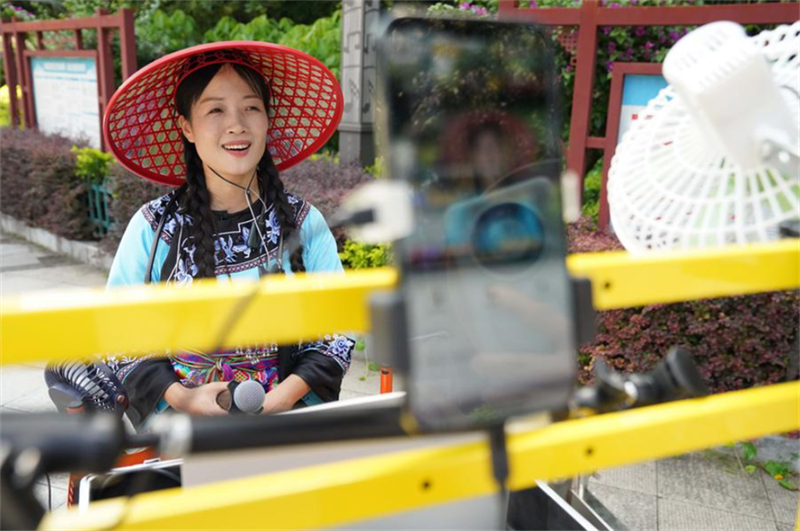Una mujer interpreta una canción folclórica a través de una transmisión en directo en Liuzhou, en la región autónoma de la etnia zhuang de Guangxi, en el sur de China, el 25 de agosto de 2024.…