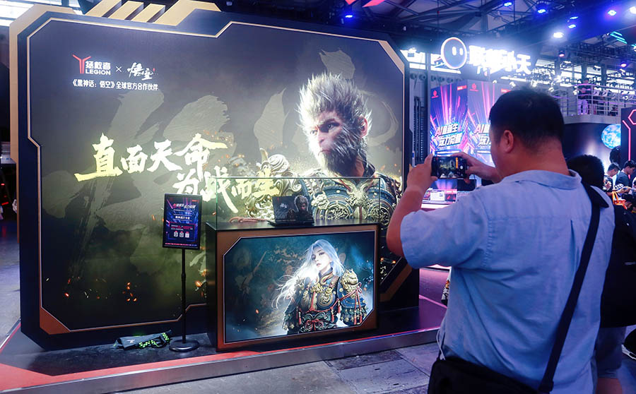 Un hombre hace una foto de una pantalla que muestra Black Myth: Wukong en un mercado de electrónica en Shanghai, el 26 de julio de 2024.…