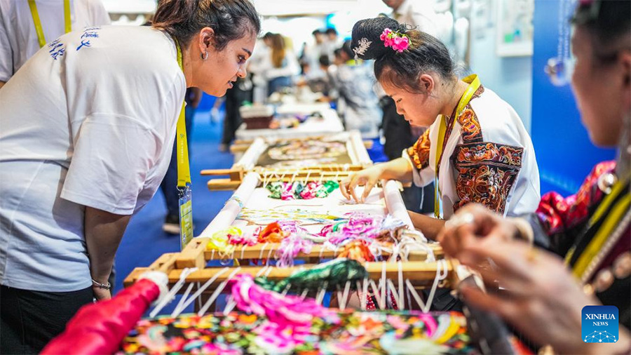 Una estudiante extranjera aprende sobre la elaboración del bordado miao durante la Semana de Cooperación Educativa China-ASEAN 2024, en la Nueva Area de Gui'an, en la provincia de Guizhou, en el suroeste de China, el 21 de agosto de 2024.…