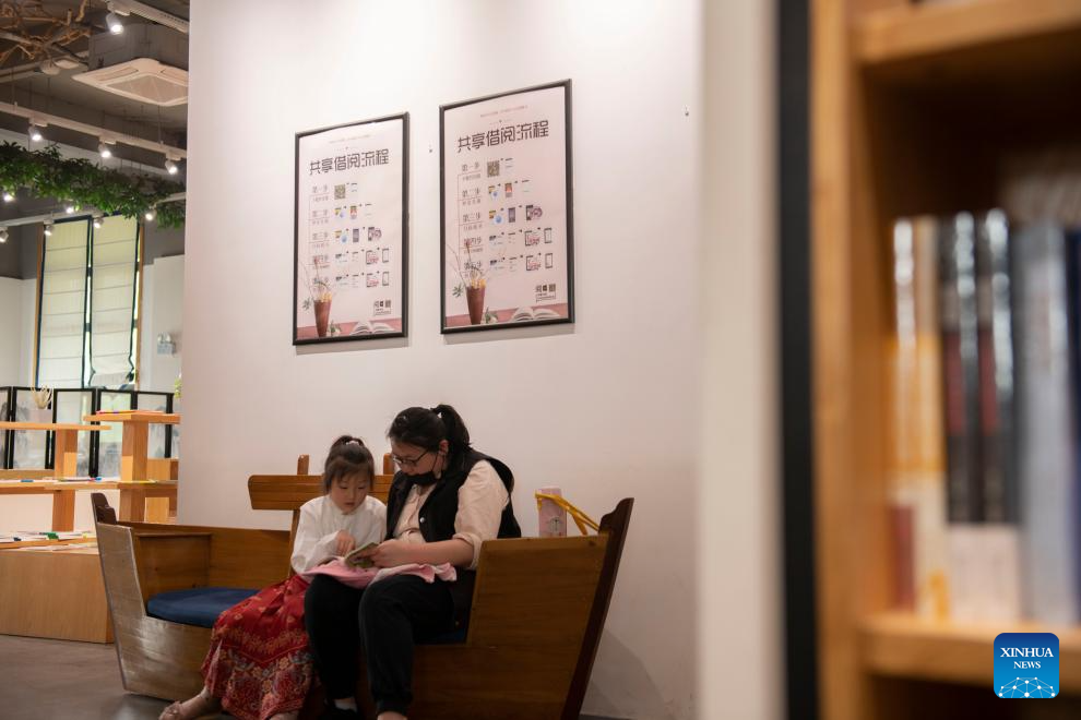 Imagen del 21 de abril de 2024 de una mujer y su hijo leyendo libros en una librería, en Hefei, en la provincia de Anhui, en el este de China.…