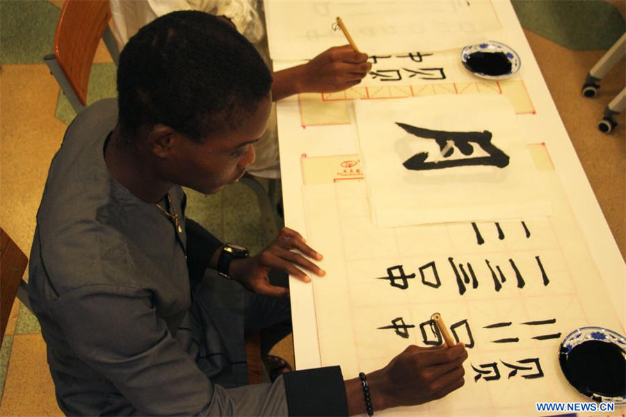 Aprenden caligrafía china durante exposición de caligrafía en Benín