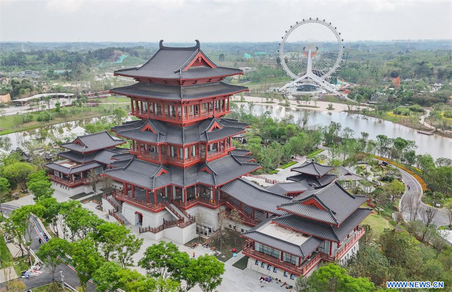 Vista aérea tomada con un dron el 22 de abril de 2024 de la sede principal de la Exposición Internacional de Horticultura 2024 Chengdu, en Chengdu, en la provincia de Sichuan, en el suroeste de China.…