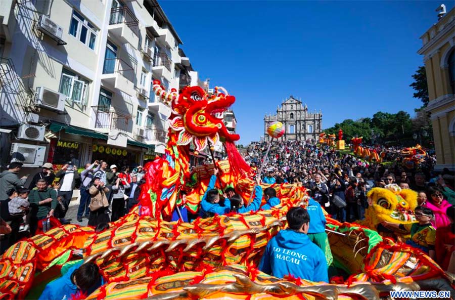 Artistas realizan presentaciones de las danzas del dragón y del león para celebrar el A?o Nuevo Lunar chino frente a las Ruinas de San Pablo, en Macao, en el sur de China, el 11 de febrero de 2024.…