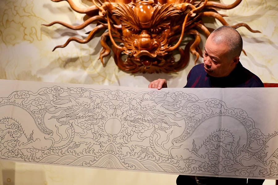Zheng Baoshu, heredero de la talla de madera del templo de Panshan, muestra un manuscrito con un patrón de dragón en la aldea de Panshan, Jinjiang, provincia de Fujian, el 27 de enero de 2024.…