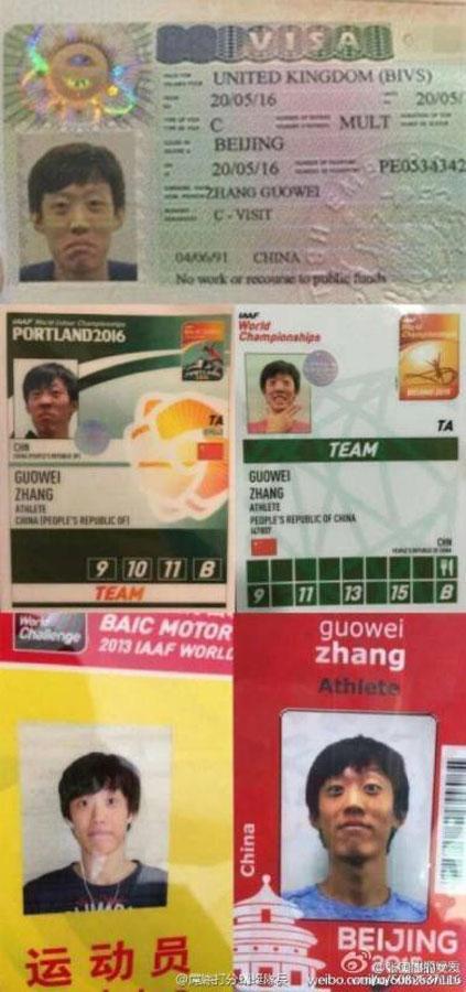 Una foto sin fecha muestra el mismo gesto en la foto del pasaporte de Zhang Guowei y en su tarjeta de identificación. [Foto: weibo.com]