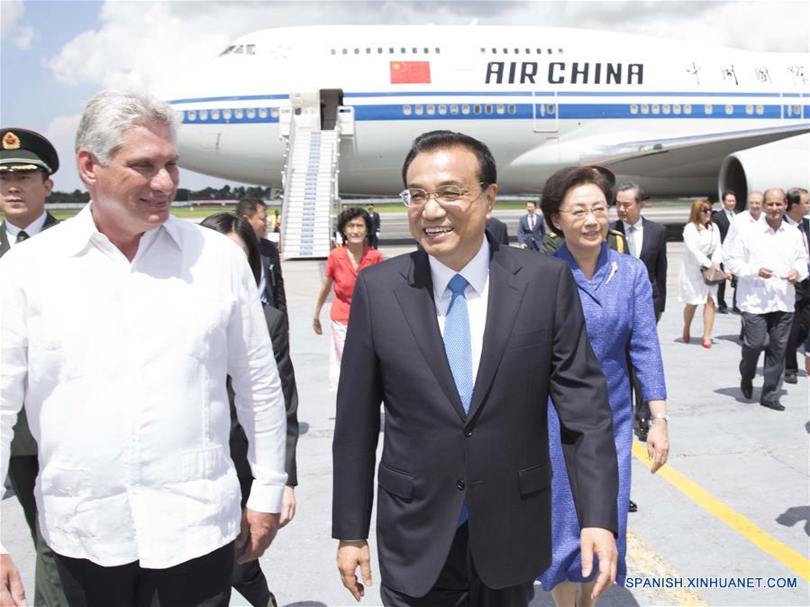 El primer ministro de China, Li Keqiang (d-frente) y su esposa Cheng Hong son recibidos por Miguel Díaz-Canel, el primer vicepresidente de los Consejos de Estado y Ministros de Cuba, a su llegada a La Habana, Cuba, el 24 de septiembre de 2016. El primer ministro chino llegó el sábado a La Habana para realizar una visita oficial a Cuba. (Xinhua/Huang Jingwen)