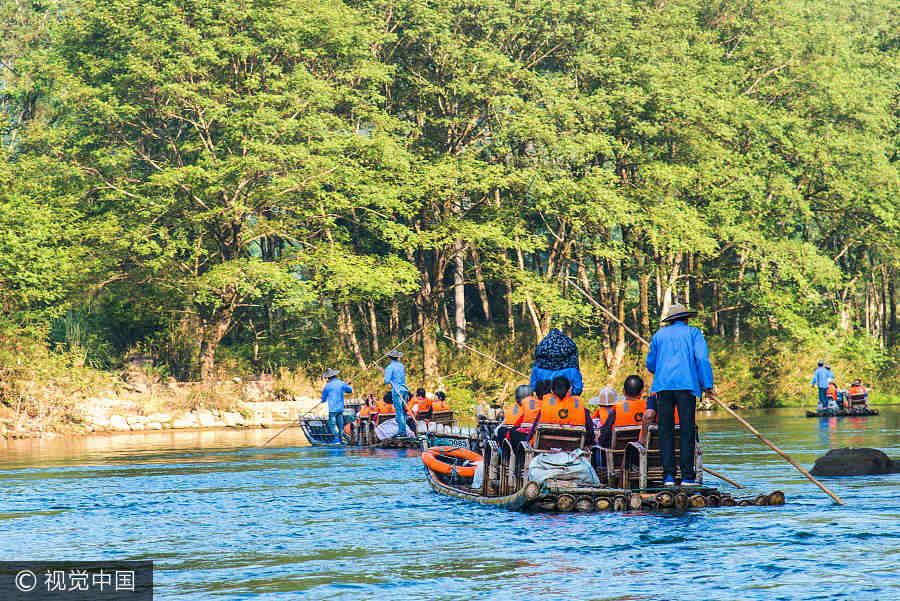 Montar en balsa de bambú por la corriente es una aventura agradable. [Foto / VCG]
