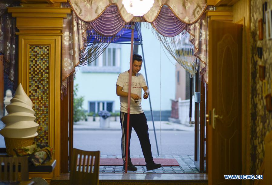 Memetynsup Sidiq, de 67 a?os, es el due?o de Margilan, ubicada en la zona turística de Kazanqi. Esta es la heladería más antigua de Yining, abierta por su padre en el a?o 1933. Memetynsup heredó el local y lo transformó en un restaurante de comida rápida, aunque el atractivo principal sigue siendo la venta de helados. Durante la temporada turística, la clásica heladería Margilan vende a diario más de 50 kilogramos de helado. En la foto, su nieto Adiljan lleva al mostrador los helados. Yining, Región Autónoma de Uygur de Xinjiang. 22 de junio de 2017. [Foto: Xinhua]