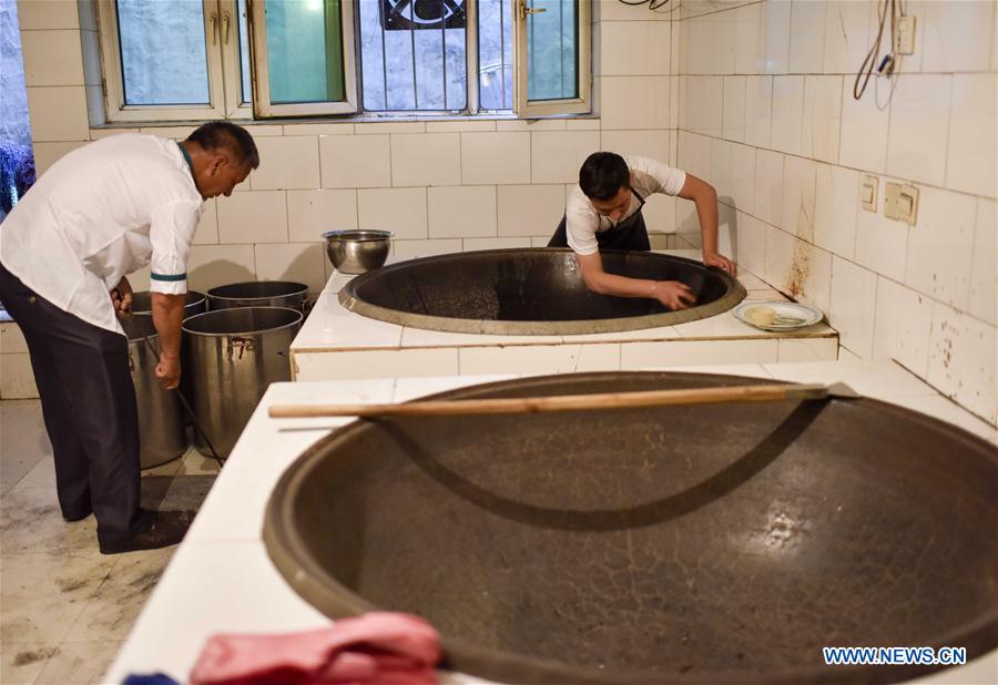 Memetynsup Sidiq, de 67 a?os, es el due?o de Margilan, ubicada en la zona turística de Kazanqi. Esta es la heladería más antigua de Yining, abierta por su padre en el a?o 1933. Memetynsup heredó el local y lo transformó en un restaurante de comida rápida, aunque el atractivo principal sigue siendo la venta de helados. Durante la temporada turística, la clásica heladería Margilan vende a diario más de 50 kilogramos de helado. En la foto, su nieto Adiljan friega la olla para hervir la leche. Yining, Región Autónoma de Uygur de Xinjiang. 22 de junio de 2017. [Foto: Xinhua]