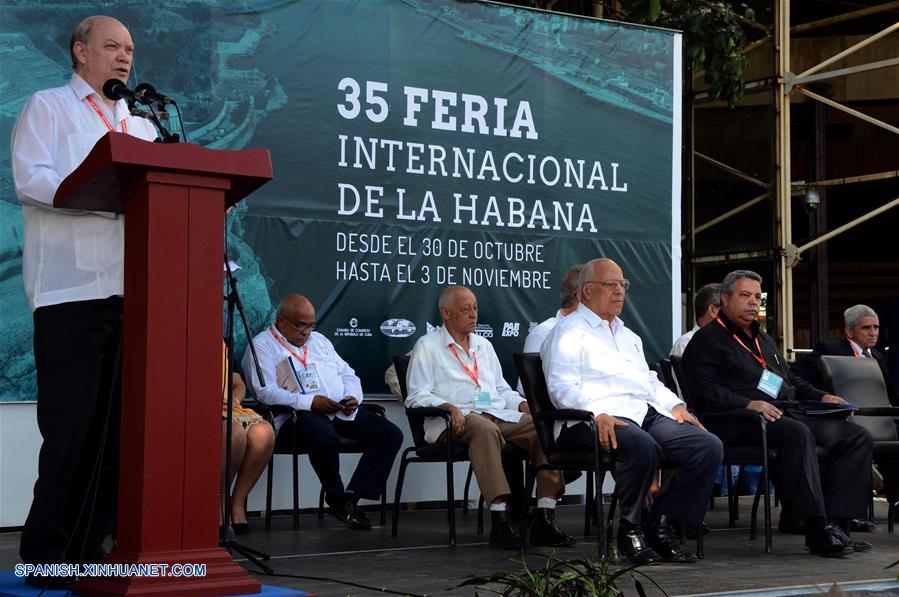 Imagen del 30 de octubre de 2017, de Rodrigo Malmierca Díaz (i), ministro cubano de Comercio Exterior e Inversión Extranjera, pronunciando un discurso durante la inauguración de la 35 Feria Internacional de la Habana (FIHAV) 2017, en el recinto ferial Expocuba, en La Habana, Cuba. (Xinhua/Joaquín Hernández)