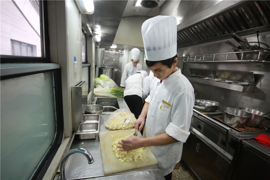 Un auxiliar de cocina prepara ingredientes para la elaboración de las comidas que se ofrecen en el tren K9441. 6 de febrero del 2018. [Foto: Bao Liang]