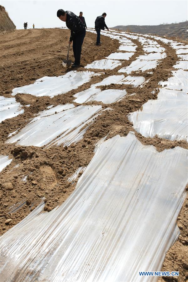 Los agricultores trabajan en un campo en Yongjing, provincia de Gansu, noroeste de China, el 19 de marzo de 2018. (Xinhua / Shi Youdong)