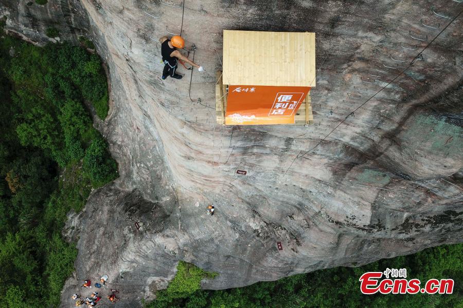 Una tienda cuelga a 100 metros de altura sobre un acantilado en el Parque Geológico Nacional Shiniuzhai en Pingjiang, provincia de Hunan. El almacén fue especialmente construido para proporcionar suministros a los escaladores. 25 de abril del 2018. (Foto: China News Service/ Yang Huafeng)