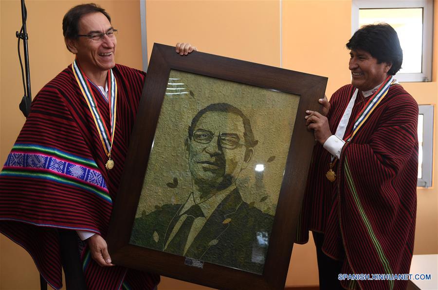 El presidente peruano, Martín Vizcarra (i), recibe un presente de parte del presidente boliviano, Evo Morales (d), después del evento de inauguración del Centro Binacional de Atención Fronteriza (CEBAF), en la localidad de Desaguadero, en Perú, el 28 de abril de 2018. El corredor ferroviario bioceánico es uno de los ocho proyectos de desarrollo conjunto que tienen Perú y Bolivia, afirmó el sábado el presidente peruano, Martín Vizcarra, durante un encuentro con su homólogo boliviano, Evo Morales. La reunión entre los dos mandatarios en la localidad de Desaguadero, en la frontera entre los dos países, se dio en el marco de la inauguración del Centro Binacional de Atención Fronteriza, durante el cual el gobernante peruano resaltó esta vía férrea que unirá los océanos Atlántico y Pacífico, a través del territorio boliviano. (Xinhua/R Zaconeta/ABI)