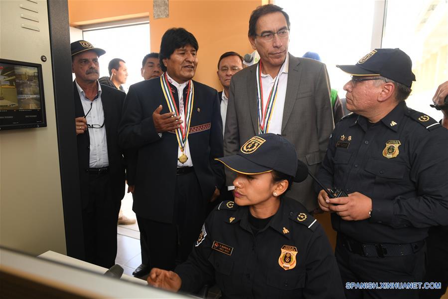 Los presidentes Martín Vizcarra (c-atrás), de Perú, y Evo Morales (2-d), de Bolivia, interactúan con oficiales de Aduanas en la inauguración del Centro Binacional de Atención Fronteriza (CEBAF), en la localidad de Desaguadero, en Perú, el 28 de abril de 2018. El corredor ferroviario bioceánico es uno de los ocho proyectos de desarrollo conjunto que tienen Perú y Bolivia, afirmó el sábado el presidente peruano, Martín Vizcarra, durante un encuentro con su homólogo boliviano, Evo Morales. La reunión entre los dos mandatarios en la localidad de Desaguadero, en la frontera entre los dos países, se dio en el marco de la inauguración del Centro Binacional de Atención Fronteriza, durante el cual el gobernante peruano resaltó esta vía férrea que unirá los océanos Atlántico y Pacífico, a través del territorio boliviano. (Xinhua/R Zaconeta/ABI)