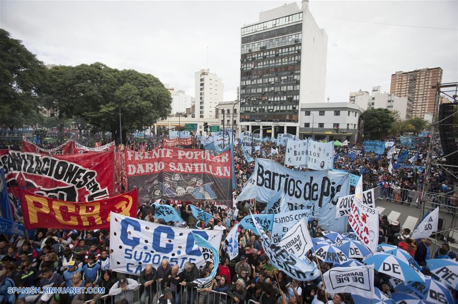 BUENOS AIRES, mayo 1, 2018 (Xinhua) -- Trabajadores participan junto a organizaciones sociales y sindicales durante una movilización conmemorativa del primero de mayo en el marco de la celebración del Día del Trabajo, en la ciudad de Buenos Aires, capital de Argentina, el 1 de mayo de 2018. (Xinhua/Martín Zabala)
