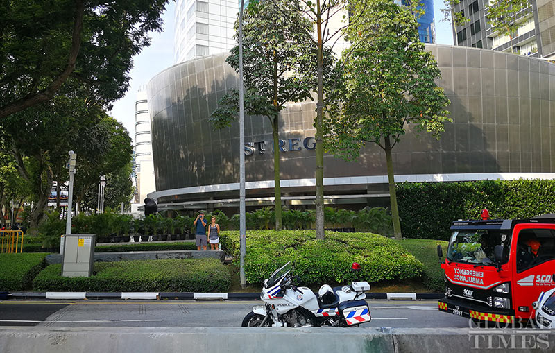 La policía y los vehículos de emergencia afuera del hotel St. Regis el domingo donde se hospeda el líder norcoreano Kim Jong-un. Foto: Yang Sheng / GT
