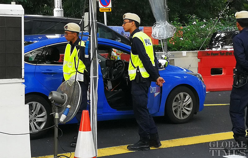 La policía de Singapur se encuentra en un puesto de control establecido afuera del hotel St. Regis el domingo donde se hospeda el líder norcoreano Kim Jong-un. Foto: Yang Sheng / GT