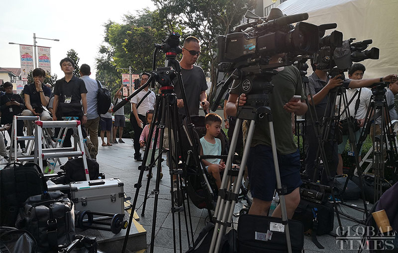 Los periodistas se preparan afuera del hotel St. Regis, donde el líder norcoreano Kim Jong-un se hospeda en Singapur el domingo. Foto: Cui Meng / GT