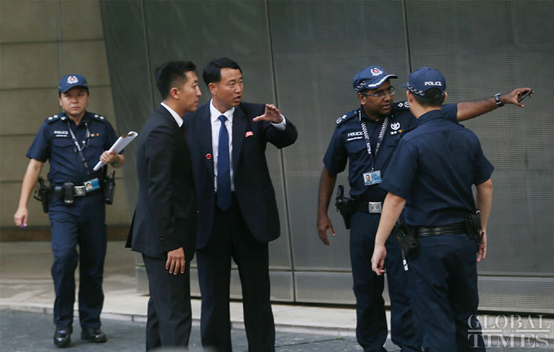 Personal relacionado coordina asuntos de seguridad con la policía afuera del hotel St. Regis donde el líder norcoreano Kim Jong-un se hospeda en Singapur el domingo. Foto: Cui Meng / GT